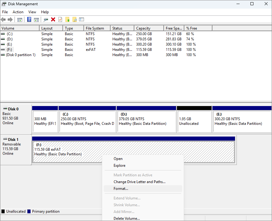 Disk Management FAT32, NTFS, exFAT 32GB max for FAT32 Moderate Built-in Windows quick fixes