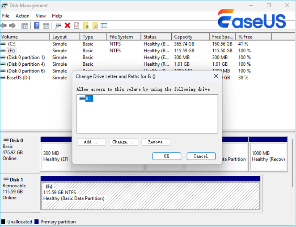 Step 2. Right-click the USB partition and choose Change Drive Letter and Paths. Click Add (or Change if a letter already exists) to assign an unused drive letter and click OK.