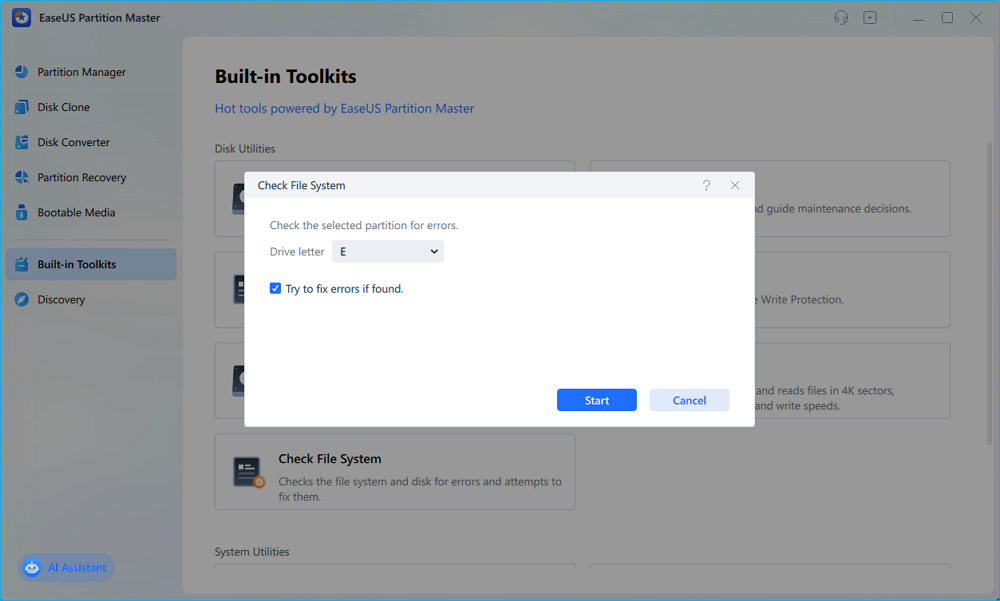 Step 1. Open EaseUS Partition Master, locate the disk, go to “Built-in Toolkits,” and select “Check File System”.