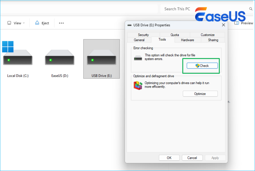 If the USB drive is detected but unreadable, file system errors are a likely cause. EaseUS Partition Master can check and repair random file system errors on a USB drive without formatting, which helps protect existing data. It also avoids the need to enter commands manually, making it suitable for beginners.