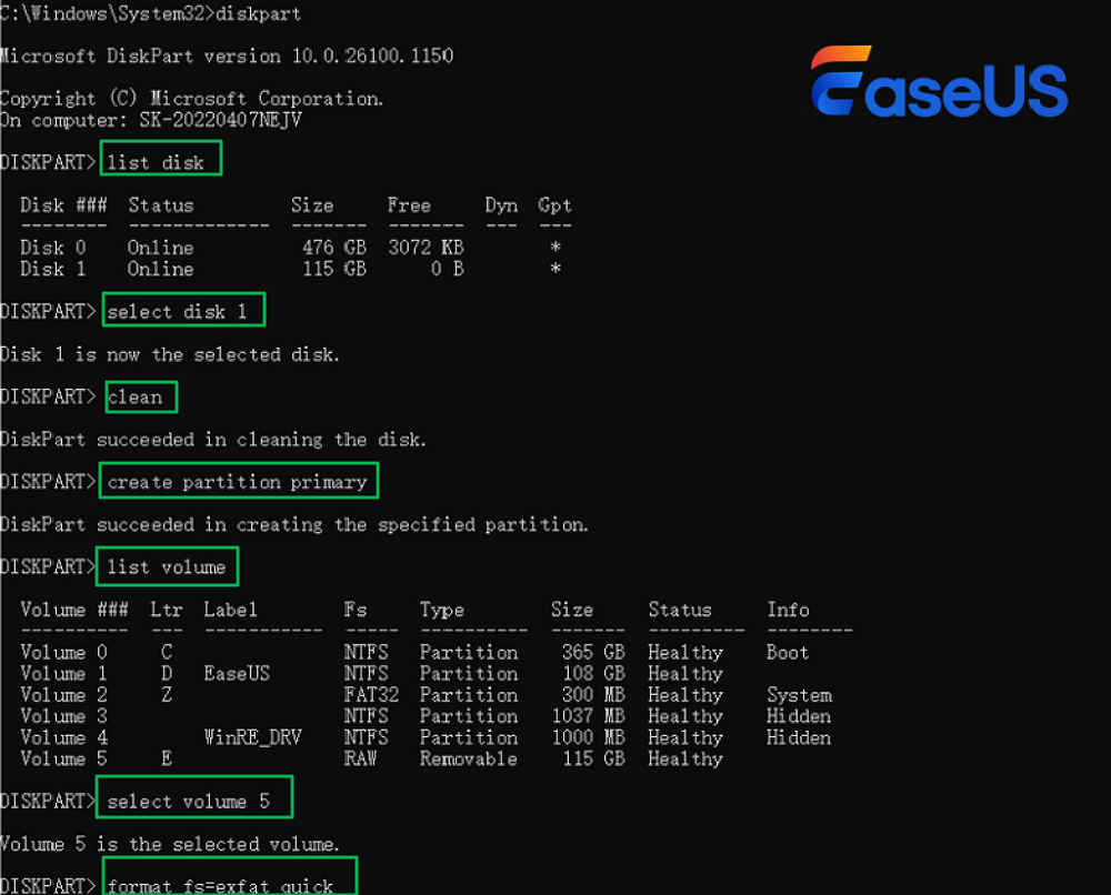 - format fs=exfat quick (Replace exfat with fat32/ntfs based on your needs)
