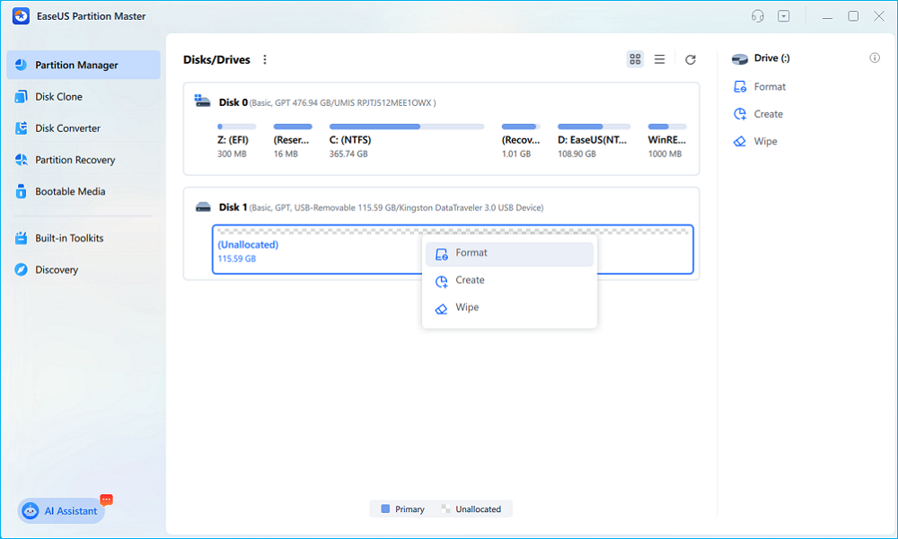 Step 2. Right-click the USB partition and select Format. Choose the desired file system (FAT32, exFAT, or NTFS).