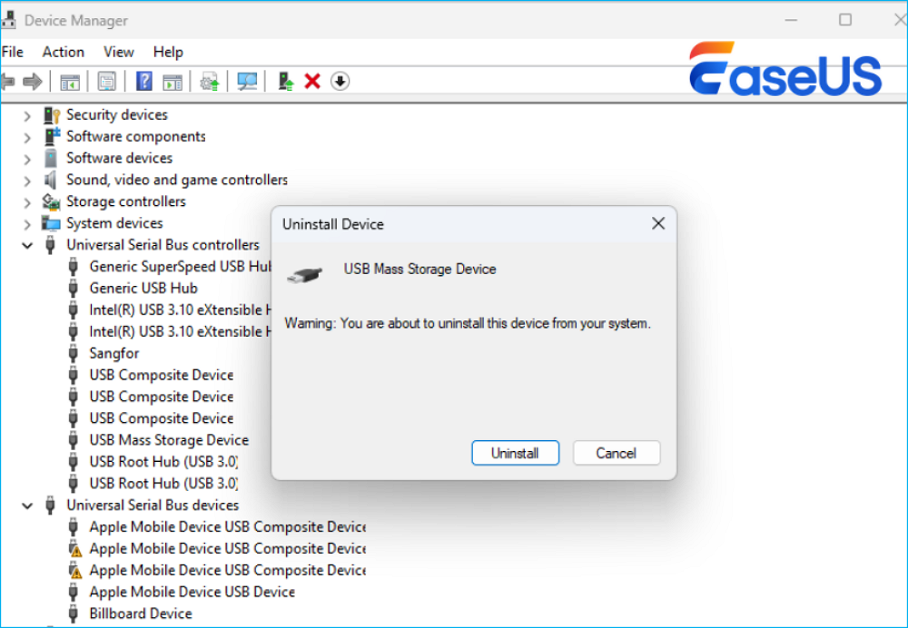 Step 3. Right-click the USB Mass Storage Device and select Uninstall device. When prompted, confirm the uninstallation.