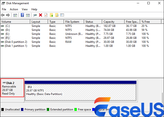 Step 6. Exit the DiskPart > reopen your Disk Management to check if the read-only status of your USB has been changed.