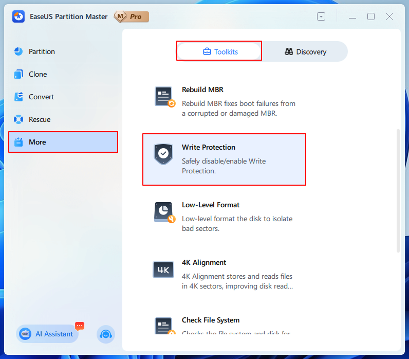 Step 2. After loading the disk, select More > click Toolkits > choose Write Protection.