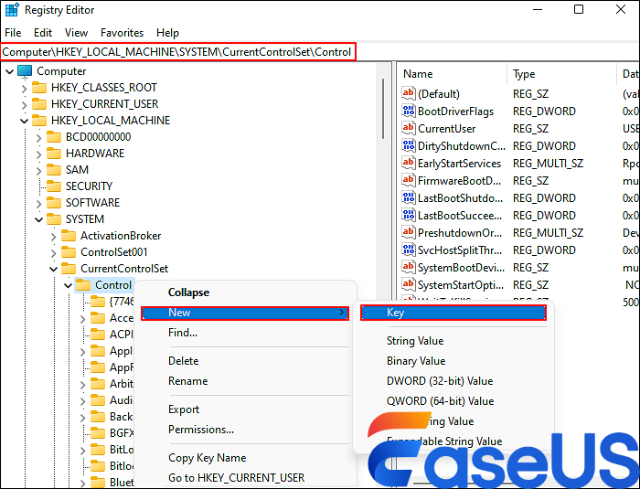 Step 3. If there’s not, please right-click on the Control folder > select New > click Key > name the new folder as StorageDevicePolicies > hit Enter.