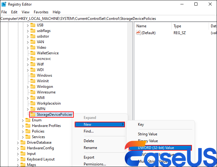 Step 4. Right-click on the StorageDevicePolices folder > click New > choose DWORD (32-bit) Value or DWORD (64-bit) based on your Windows version. Here, I select DWORD (32-bit).